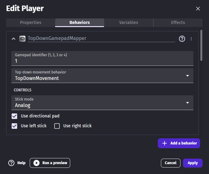 The "3D shooter gamepad mapper" behavior can be added to a 3d physics character to make the character move according to player inputs automatically.